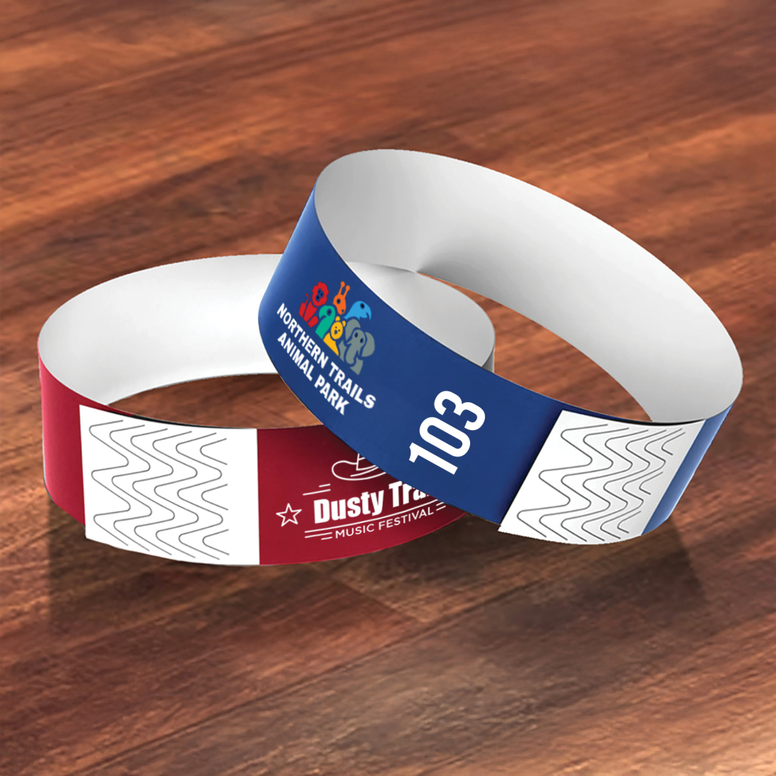 • Digitally printed wristbands are made from 7.5 mil. poly weave material. Waterproof, secure, tamper resistant adhesive closure, guaranteed to stay on!