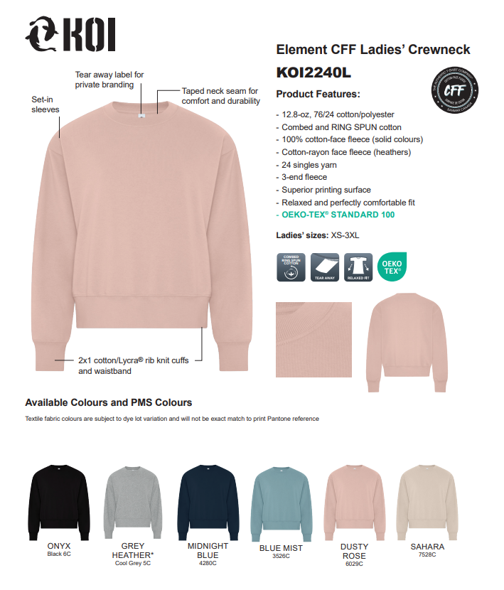 Built for comfort, made to create. The KOI® Element CFF Ladies’ Crewneck is crafted from ultra-soft cotton-face fleece for smooth, detailed prints and incredible comfort without compromise. With a relaxed, flattering fit and OEKO-TEX® certified fabric, this elevated staple is made for creators who want it all: comfort, quality, and standout results.
