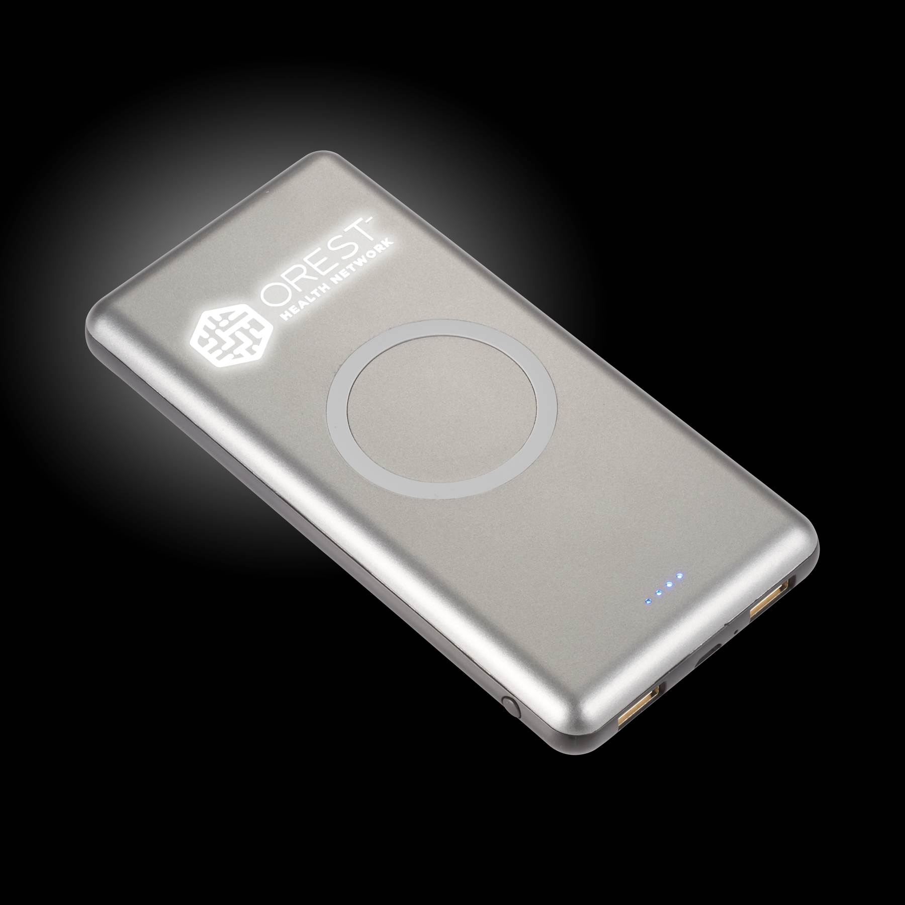 The UL Listed Light Up Qi 10000 Wireless Power Bank lets you charge smartphones wirelessly. Featuring a 10,000 mAh/37Wh lithium battery, the power bank supports wireless charging for a wide range of iPhones and Android smartphones. The logo will glow while the product is charging, providing a convenient indicator light so you know the power bank is working. This item comes with one USB-to- Micro-USB charging cable and has two USB outputs. Power banks are permitted in carry-on luggage only, and at the discretion of TSA agents. Please charge power bank before initial use.